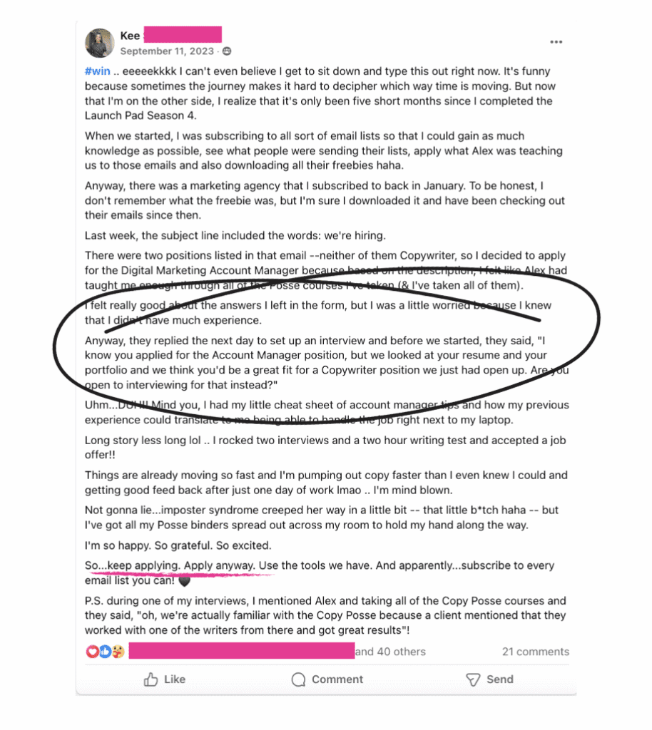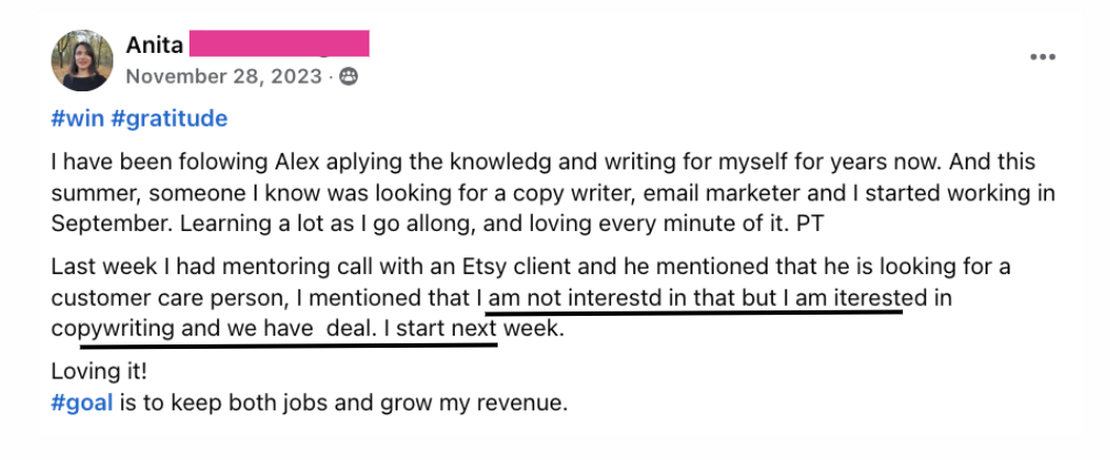 Or Alexandria – who posted her Copy Posse Launch Pad certificate on completion on Linkedin and had her CURRENT BOSS reach out and offer her her first copywriting job!
