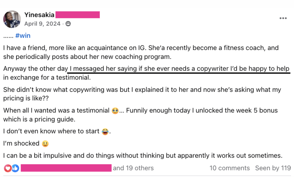 My student, Chi, a copywriter from Season 2 of the Launch Pad got her first client by following them on social media and regularly checking out their posts. One day, they posted a copywriting opportunity, and she applied and got the job.