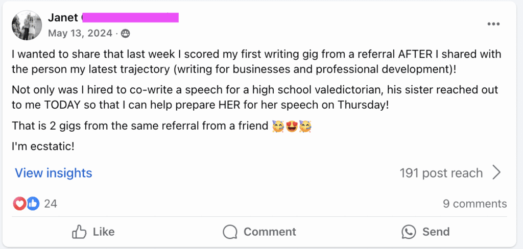 And another, Janet, who got her FIRST writing job from a referral after sharing her newest business trajectory…